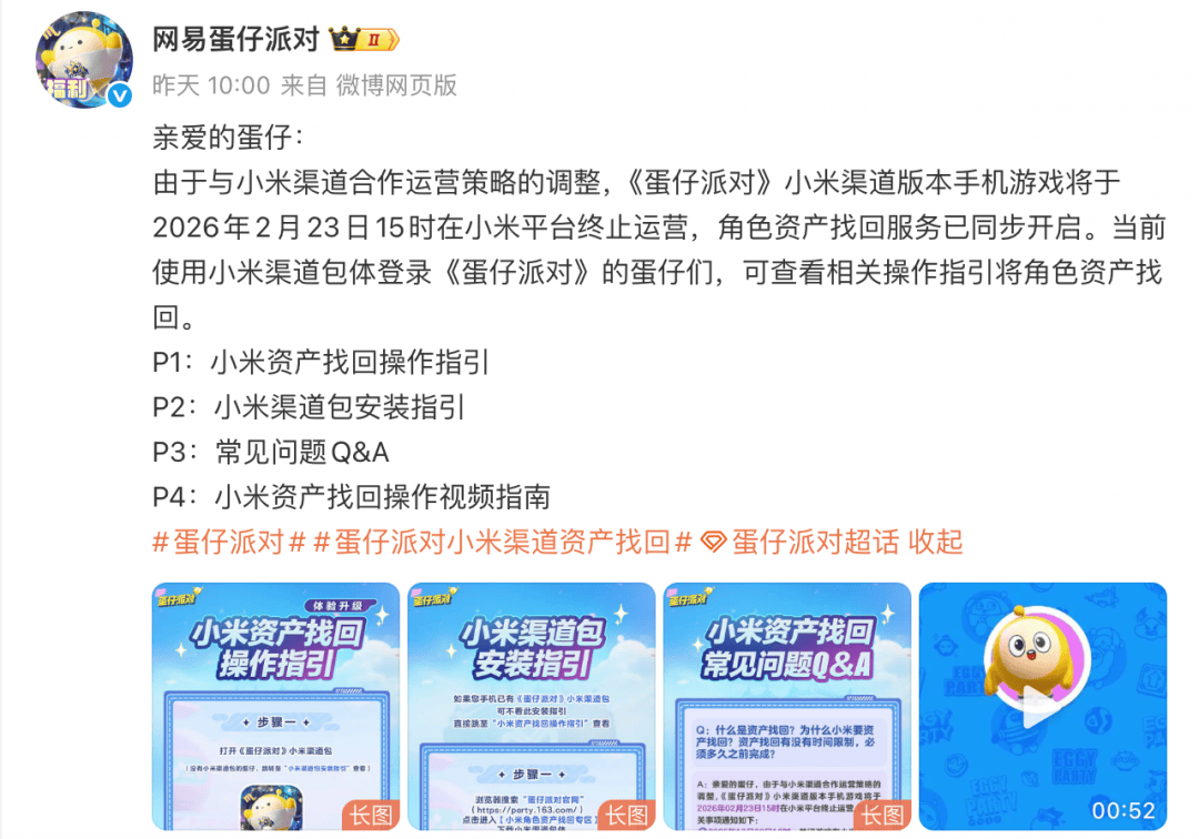 网易蛋仔派对官微发文称,由于与小米渠道合作运营策略的调整,《蛋仔派对》小米渠道版本手机游戏将于2026年2月23日15时在小米平台终止运营。