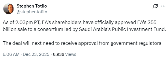 12月23日,外媒游戏记者Stephen Totilo爆料表示,EA(电子艺界)的股东已经正式批准了收购案件进程,将由沙特阿拉伯公共投资基金(PIF)牵头组成的投资财团以总价550亿美元收购。该交易接下来还需要获得政府监管机构的批准。