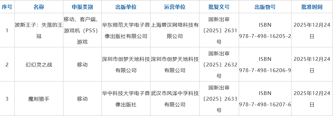 12月25日消息,今日12月批次版号正式下发,其中国产游戏144款,进口游戏3款;另有7款游戏审批信息出现变更。