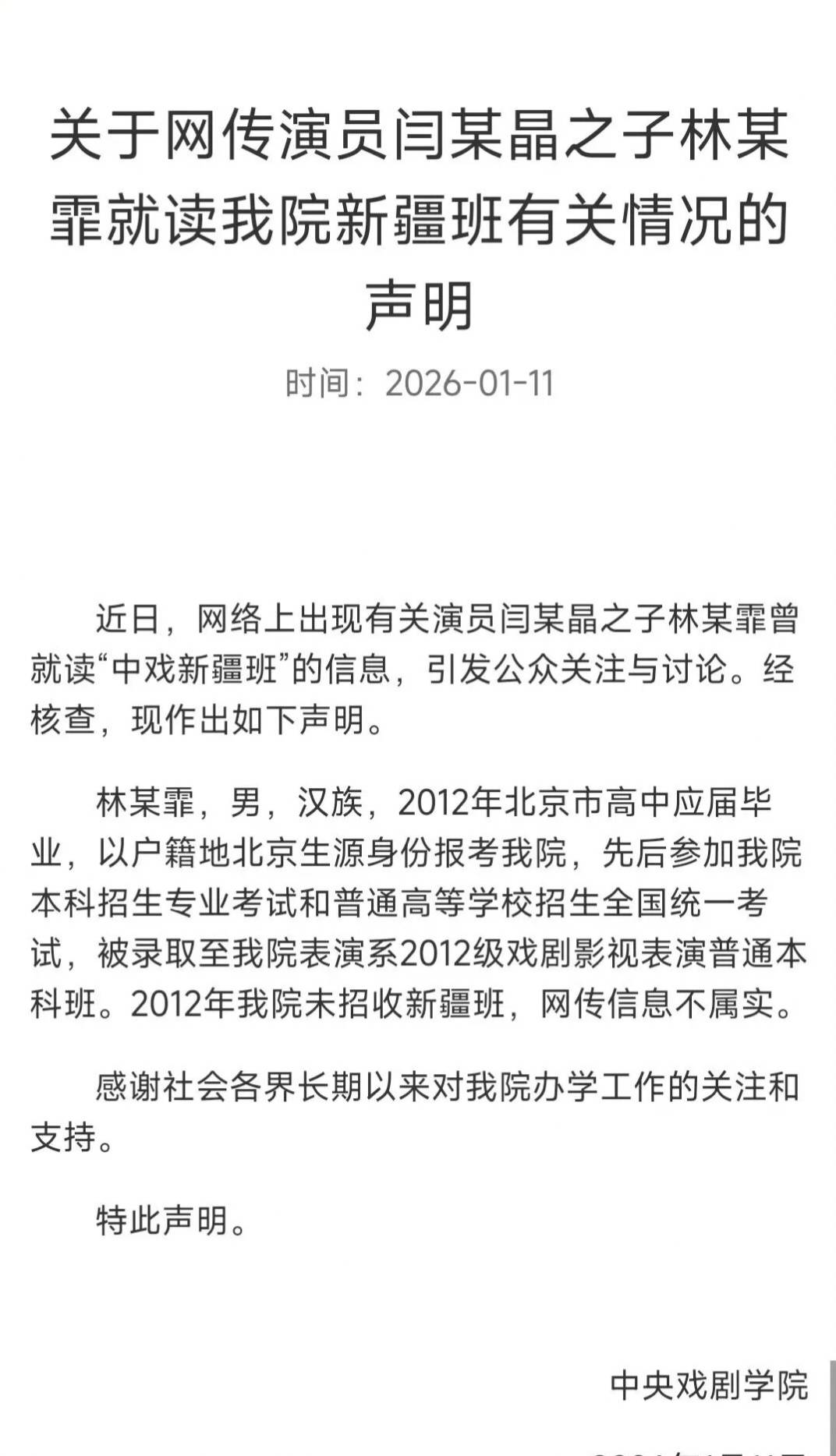 1月11日,中央戏剧学院发布声明,称林傲霏为汉族,2012年以北京应届生身份报考,通过专业考试和全国高考录取至普通班,且2012年中戏未招收新疆班,网传信息不实。同日晚,闫学晶在朋友圈发文致歉。