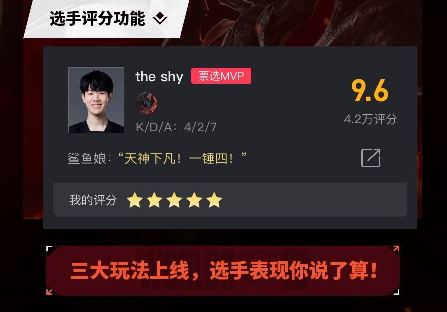 选手评分功能应该是很好理解的。在每一场比赛结束之后,网友们可以根据选手们在这一场比赛的综合表现,给出合理的评分。同时,还能够锐评该选手在这一场比赛中的表现。如果你的锐评足够尖锐、足够有趣,或许还能够成功上墙让更多的人看到。